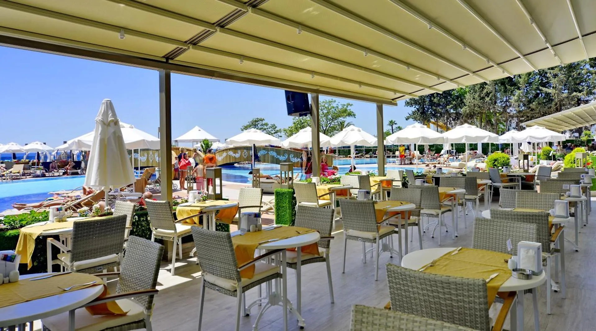 Das Azura Deluxe Resort & Spa - Ultra All Inclusive Avsallar bietet täglich ein Frühstücksbuffet, das im Restaurant serviert wird. Die Poolbar mit Karaoke und einem TV ist ein perfekter Ort zum Verweilen. Das Restaurant Nokta Restaurant hat eine eigene Auswahl an europäischen Gerichten und liegt circa 6 Gehminuten von hier entfernt.